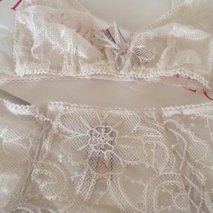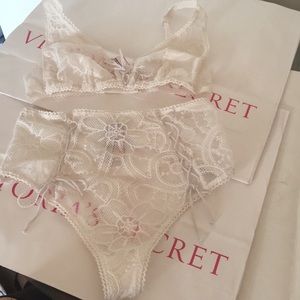 Brand new with tags Victoria’s Secret Dream Angels Set. The bralette has no padding or underwire. All lace and mesh with adjustable straps. The underwear are high waist thong style. Could be a perfect bridal wedding set. Comes from a smoke free home. If you have any questions or need more pictures please ask!