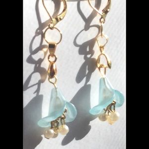These beautiful earrings will add an elegance to any outfit! The hardware is 18K Gold Plated. The roses are frosted blue with pearls inside that dangle.From the bottom of hook to the bottom of the pearls, the measurement is almost 2 inches length.