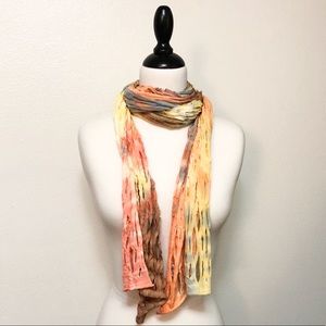 Unique fishnet cut fashion scarf! Watercolor/ombré style dyed polyester, but feels very “cotton-y.” Color scheme included orange, yellow, gray-blue, brown, mauve.