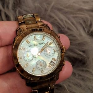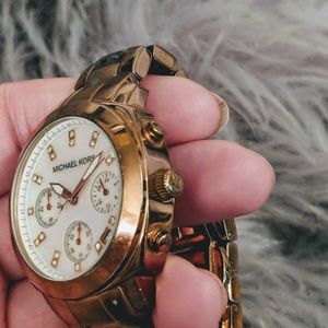 Great watch by Michael kors. It's been well worn but has tons of life left. Needs a new battery, and would work best for smaller wrists. It's snug in me and I have a 6 inch wrist. Took pics with a hi-def camera, so you can see scratches and tarnish. Still very beautiful to the eye and goes great when stacking bracelets!