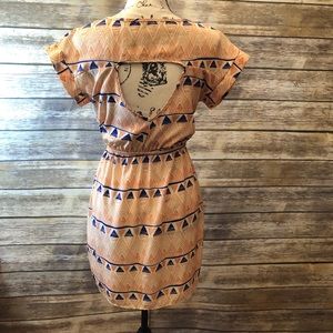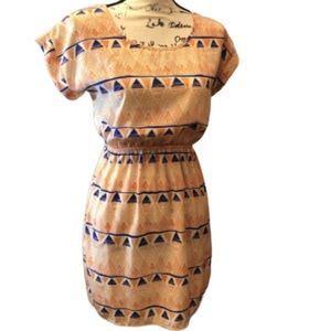 I love the colors of this print Dress. Creamy Orange background with orange triangles,diamonds, and graphic (pyramid) lines. As well as blue stripes and blue triangles. Check out the pictures for approximate measurements.