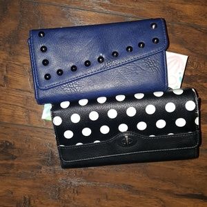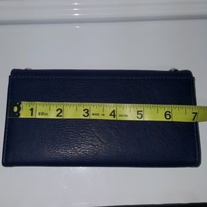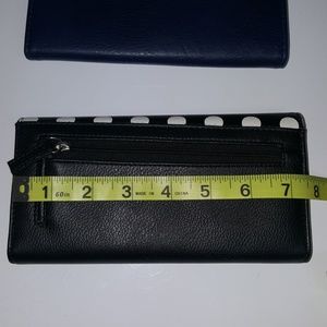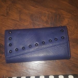 1. Dark navy color with metal studds. Credit card slots and change pocket.