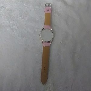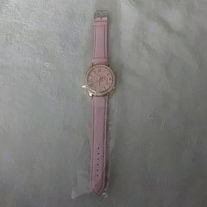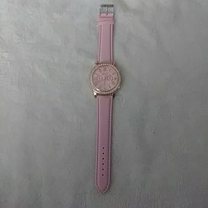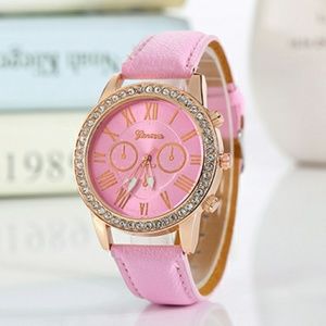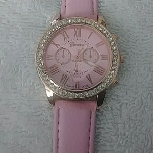 Pink face Geneva watch, pink band, roman numerals, and very cute.