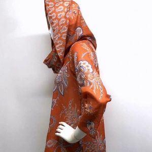 MEASUREMENTS (NOT stretchy): chest 21" pit to pit, across bottom 23", length 28.5", 3/4 length sleeves 20" from shoulder, COWL / HOOD 17.5" x 22", side slits at bottom