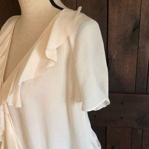 A flutter of delicate ruffles embellish the wrapped shape of a romantic silk top with a bit of added flounce, compliments of an elastic, banded hem and pleated back. Faux wrap styling. Color: Porcelain (creamy white)