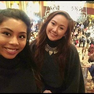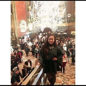 Contemporary cropped charcoal colored sweater. Not itchy, very warm, very comfortable. Not heavy. Batwing-like sleeves and turtleneck-like top. Worn once.