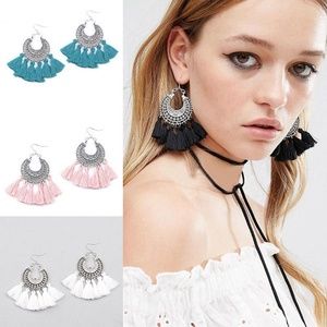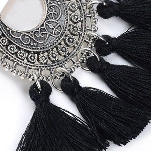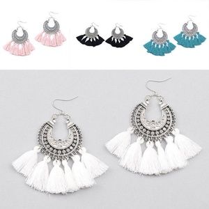 These earrings are a very trendy bohemian fringe design set on antique silver tone half moons, in the color "WHITE." The perfect accessory to transform any outfit into a Wow!