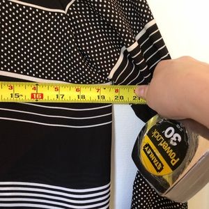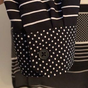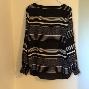 White & Black Ann Taylor LOFT Blouse, long sleeved, size S. Washing instructions as pictured. Button closures at the wrists, with black buttons. Lightweight, somewhat see through material. Would be best when worn with an undershirt or tank top.