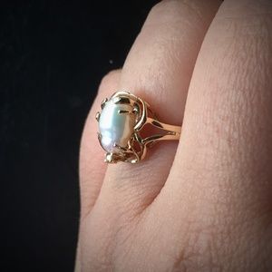 NO FURTHER REDUCTIONS! THIS IS PRICED TO SELL. This is a beautiful 14k free form gold ring with large baroque pearl on center. It has a white topaz as accent at the bottom. Very unique and beautiful. Ring is a size 6, and weighs 2 grams.