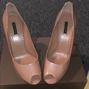 Paten Leather, Open Toe, Rose Color, Size 40. Comes with box, garment bag, & heel replacements.