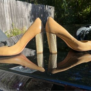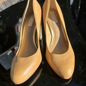 These pumps are so beautiful and comfy! Nude, natural, or tan pumps that are perfect to dress up or down. These are true to a size 9. Maybe worn 3 times, excellent condition