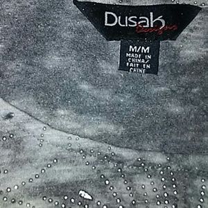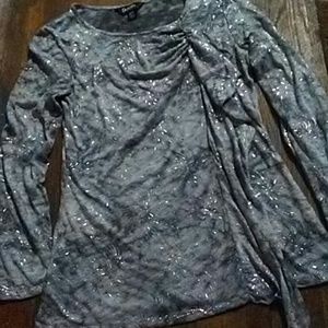 New Dusak Designs grey/silver beaded burnout long sleeve top. Light grey silky fabric with beautiful silver beaded design and a flowy scarf like detail. New never worn. In perfect condition!!