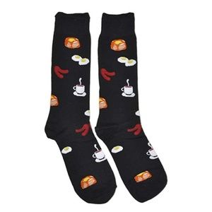 Men's Bundle of Breakfast Dress Socks. Features- Stylish and fun print, comfortable, durable, bundle includes two pairs. Material- 80% cotton, 15% polyester, 5% spandex. Size: 10-13 (OS). Other designs available, bundle to save. Care Instructions- Machine wash warm with similar colors, use only non-chlorine bleach when needed, tumble dry medium.