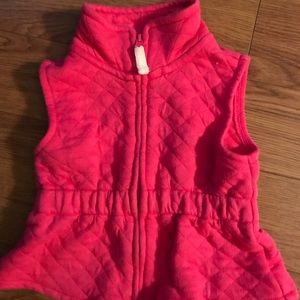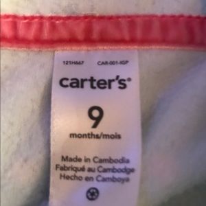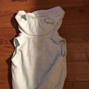 Two Carter’s Vests (9 months). Perfect for the Fall! One is pink quilted style with zipper. The other vest is pale blue with white polka dots and owls on two front pockets. It zippers up front and has hoodie with bear ears on it.