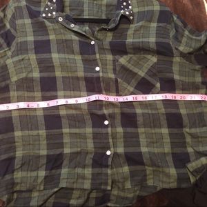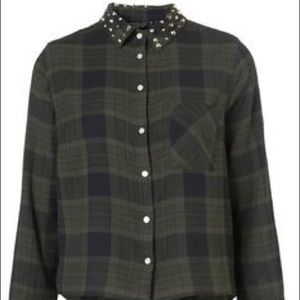 Green and black spiked collar, flowy fit plaid Topshop button down (snaps). Like new.