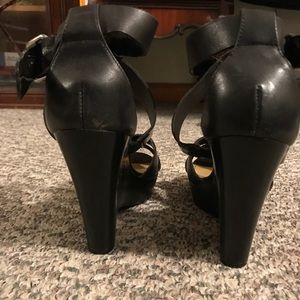 Fun strappy wedge heels! Black leather straps and plain black heel perfect for any evening outfit! 4 inch heel with platform