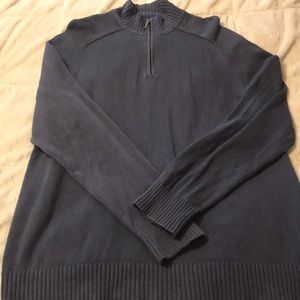 This blue sweater is a soft material. Worn a lot but still in great condition. 100% cotton. It has a zipper to make it easier to put on and off. Size Large in Men’s.