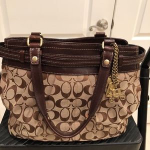 This Coach bag is Tan and Dark Brown 14” Length and 10” Height. Used a few times Great condition