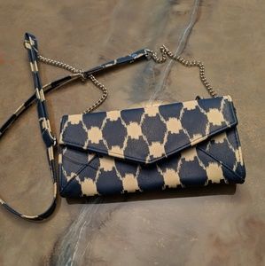 Chain strap, snap close, card holders on inside, navy and white pattern