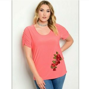 Coral plus size scoop neck short sleeve fitted shirt with flowers embroidered on the front bottom left.