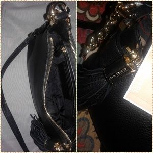 Beautiful "Weston' small messenger crossbody. Pebble leather with golden hardware, zip top with tassel. Interior zipper side pocket, and 1 slip pocket. Dimensions: 10x6.5x2, drop: 24 inches.