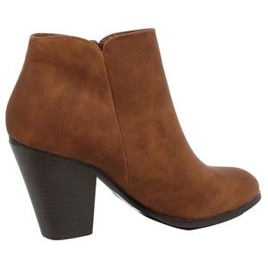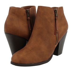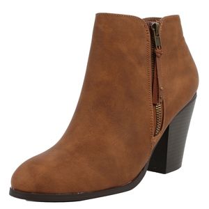Ligth Tan distressed faux leather tassel zipper that zips for easy slip on with heel approx. 3 1/2". Model is a size 7, and a size 7 fits her perfectly.