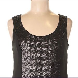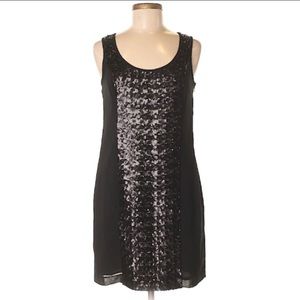 Beautiful sleeveless party dress. Sequin detailing is from top front straps down front-center of dress, creating a very flattering effect for the wearer. Dress is fully lined.
