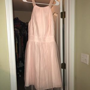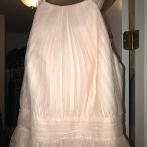 Light pink. Actual color is called petal. Worn once in wedding. Zip up back. 100% polyester. Like new. Size 14.