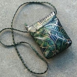 Tropical chic, three pockets two have zippers. Main opening has a zipper. An 8in by 7in bag with a 64 in adjustable strap.