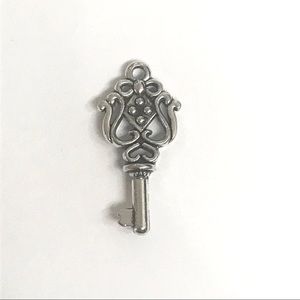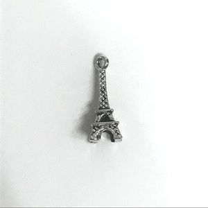 Silver Eiffel Tower, silver ring with blue stones, red glass bead, silver key, silver USA, silver clock, and silver flower charm.