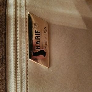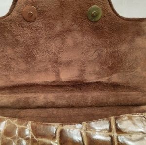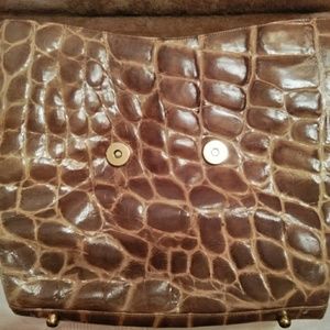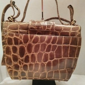 This purse can be worn as a tote or crossbody. The color is a khaki green/taupe. It has suede interior lining, inside zipper compartment, back snap Burton closure compartment, adjustable shoulder strap and a separate tote strap. Good condition.