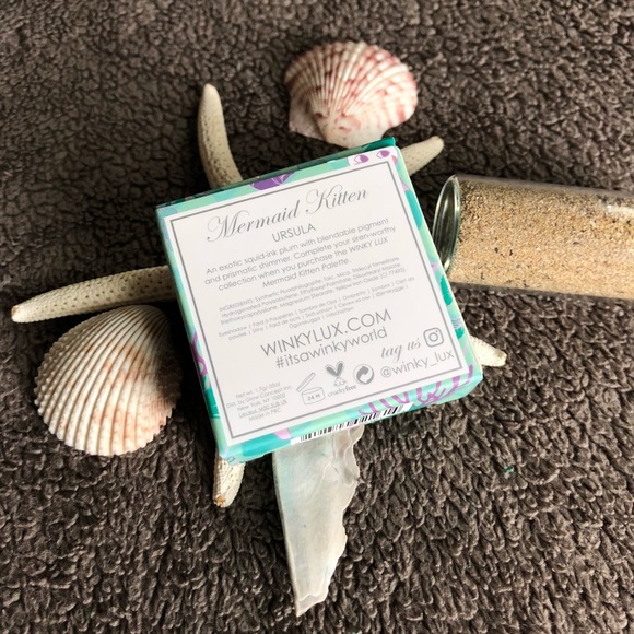 From WinkyLux’s Mermaid Kitten Pallette, the shadow color URSULA/box: “an exotic squid-ink plum with blendable pigment and prismatic shimmer. Complete your siren worthy collection when you purchase the winky lux mermaid kitten pallette” #itsawinkyworld