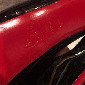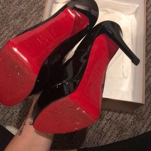 Black patent leather lady peeps, red protectors on the bottom so they are always looking brand new, worn maybe 3-4 times. Almost perfect condition. Size 37.5. Comes with everything pictured