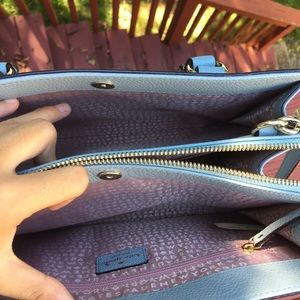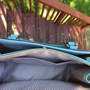 Central compartment with top zip closure; Interior features custom fabric lining, 2 slip pockets, and 1 zip pocket