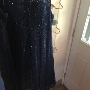 Dark navy blue, little past knee length, with sequin detail and lace detail around neck