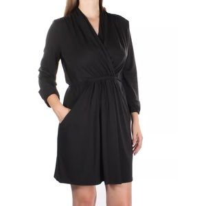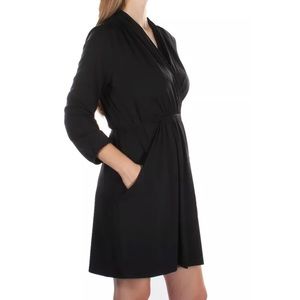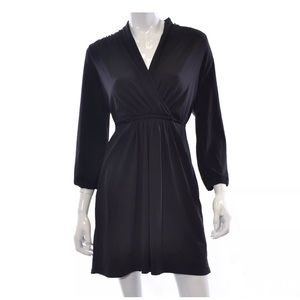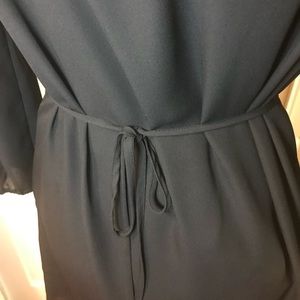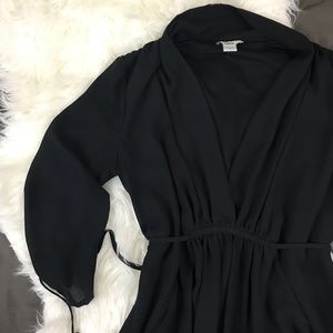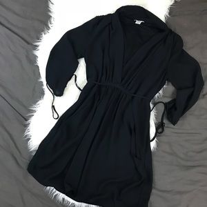 Ties at the back. The deep v is sexy but the fabric falls in such away that it should not show too much.