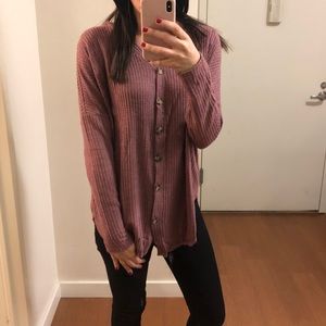 • Long sleeve waffle knit button front cardigan with scoop hem