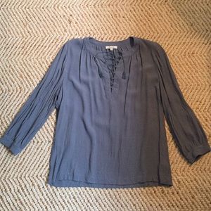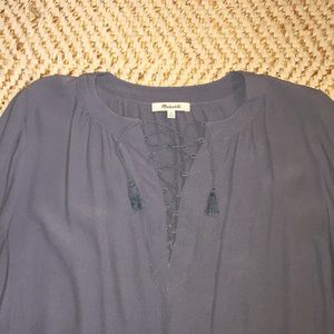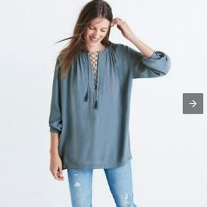 A soft, shirred peasant shirt with an easy lace-up neckline trimmed in tassels.