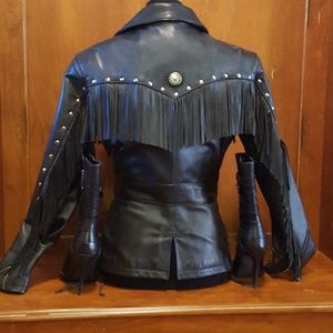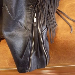 Very cool, lots of detail. The fringe,all the buckles and hardware. Leather with a 100% cotton lining on the inside. Zip up on sleeves, lace up on the sides, EUC, only wore a couple of times, 18" across from armpit with jacket laying flat and zipper. 15" waist and 27" long