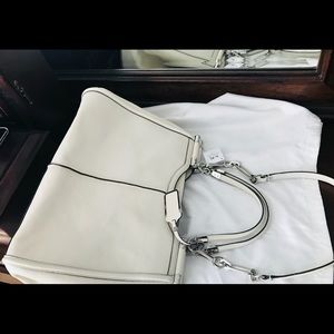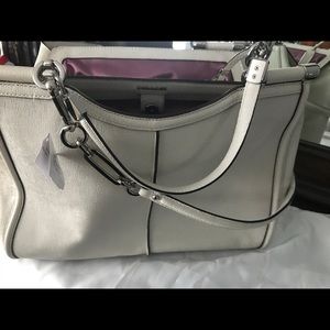 Brand new with tags! Comes with Coach storage bag. Creamy White leather , lavender satin fabric size interior. Gorgeous bag!