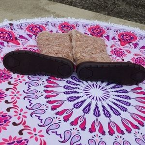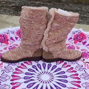 MUKLUKS faux fur lined boots in blush with rubber soles, memory foam and gold button and bling on the sweater part of the boots as accents.