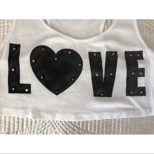 White ribbed, loose fitting crop top with LOVE printed on the front, with embellishments on the letters