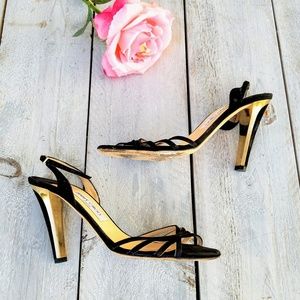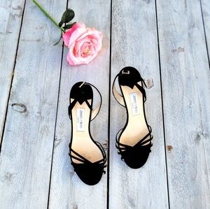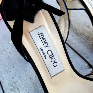 Absolutely gorgeous black suede leather size 39.5 Jimmy Choo London heels. These feature a gold almost mirror on the underside of the heel. They do run small because i wear an 8 sometime 8.5 and they fit me perfectly. Super sexy shoes👠👠👠