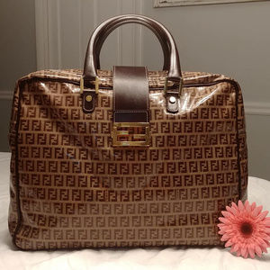 Crafted of FF monogram coated canvas (has a shine) with dark brown leather.