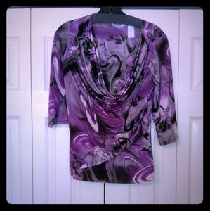 Beautiful abstract art design in Purple, Black, Gray and Cream; accented with shimmers of Gold throughout. Polyester/Spandex blend, cowl front gives it a layered effect. Excellent condition....like new!