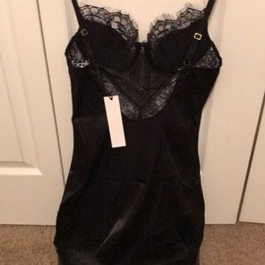 95% Polyester 5% Spandex Lace Mini Dress where the straps adjust and it does stretch.