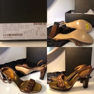 NIB Gucci Bronze / Gold Metallic Braided Strap Sandal Heels w Teak Wood Stacked Heel & Ankle wrap Buckle Detail - Sz 8