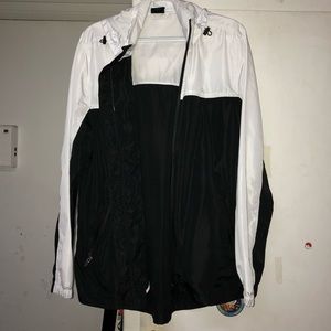 It’s is a black and white standard issue jacket it is good for light rain and it is in really good condition it is warm and goes nice with layering