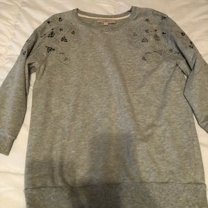 Super soft grey sweater with floral design cut outs.
