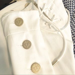 Adorable flare trousers with a nautical flair! Gold side buttons and cute lace up detail in back. Cotton, linen, elastane blend, raw hem.
